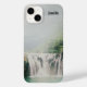 Ett telefonfodral med ett fantastisk-foto. En antennsyn på några utandningsluftsvattenfall omgiven av en lush grönt av träd och berg.