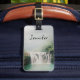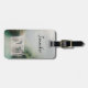Ett bagagemärke med ett fotografi av fantastisk. En antennsyn på några utandningsluftsvattenfall omgiven av en lush grönt av träd och berg.