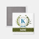 En ömtålig ivandeandning med en blå stripe-buk läggs över en färsk vit bakgrund. Bröllop har rätt design med monogrammet K i blått. Magnet kan vara personlig med valfri namn över banderollen grönt. Designtips: För det teckensnitt som visas här användor du alla versaler för namn.