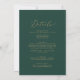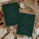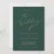 Den här känsliga kalligrafgrönten guld i en bröllopsinbjudan är perfekt för ett modernt bröllop. Den romantiska minimalistiska designen har fin och elegant champagne gyllene gult-typografi på en mörk grönt bakgrund med ett rent och enkelt utseende. Spara papper genom att inkludera uppgifterna på baksidan av bröllopsinbjudan i stället för på ett separat djurutrymmeskort. Ta även med OSA-informationen om din gäst svarar elektroniskt (valfritt).
