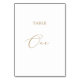 Detta känsliga kalligrafi bord ett-bordsnummer i guld är perfekt för ett modernt bröllop. Den romantiska minimalistiska designen har en vacker och elegant champagne gyllene gult-typografi på vit bakgrund med ett rent och enkelt utseende. Kortet skrivs ut på framsidan och baksidan (dubblan). Andra bordsnummer i samlingen säljs separat.