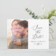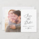 Det här känsliga svarta kalligrafifotot som sparar datumkortet är perfekt för ett modernt bröllop. Den romantiska minimalistiska designen har fin och svart typografi med elegant på vit bakgrund med ett rent och enkelt utseende.