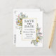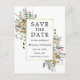Modern Watercolor Wildblomma Bröllop Bröllop Förlovning Announcement Save Date Postcard omfattar gult, rosa, lila, blommor i dammblått och vitt vild, eukalyptus löv, grönt av sage löv och annat botaniskt grönt på guld.