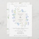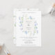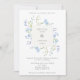 En inbjudan från elegant bröllop med en mittpunkt i ram omgiven av ömtåligt blåa blommor och grönt. På andra sidan inbjudan ligger en mönster av vattenfärgen blåa blommor och grönt.