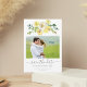 Fintvätt med vattenfärg gula blommor dekorerar den här vackra sommareftermiddagen Spara datumkortet ovanför förlovningens foto. Trädbröllopskortet har botaniskt löv under eleganten soliga peonier ovanför ditt favoritfoto. Blommigt och ljus, perfekt för en utomhusceremoni.