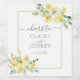 Fintvätt gula blommor dekorerar denna vackra sommareftermiddag bröllop vin. Trädgårdsbröllopets tjänst accentueras med en mjuk grönt rektangel gräns och botaniskt löv under elegantens soliga ponnyer. Blommigt och ljus, perfekt för en utomhusceremoni.