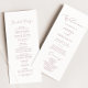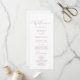 Detta känsliga kalligrafområde i ro guld är perfekt för ett modernt bröllop. Den romantiska minimalistiska utformningen har en vacker och dammig elegant ro rosa-typografi på vit bakgrund med ett rent och enkelt utseende. Ta med namn i bruden och trimmen, datum och plats för bröllop, tack, serviceordning, brudens sida och ett minnesmärke "i kärleksfullt minne" som tillval.