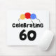 Tre primära färgballonger och svart text, som läser "att fira 60" på 60th födelsedagkort, T-tröja, muggar och mer.
