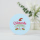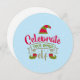 Whimsisk rund julkortdesign tomtesskor och hatt med "Fira din inre tomte" text på snöig himmelblå bakgrund