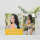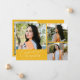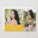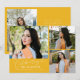 Modern och fantasifull examensannonserings fotokort med 3 bilder på framsidan och 1 på baksidan. Texten säger "fira examenstudenten" i skrivstil. Lägg till studentens namn, information och meddelande för att anpassa detta kort. Gul.