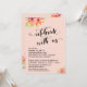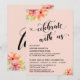 Mot en redigerbar rosablommig bakgrund har jag placerat små målade sprays av boho-vattenfärgblommor och en typsnittsgrafik som lyder "celebrate with us" med ett utsmyckat skrivstils-teckensnitt med hjärtan. Nedan visas dina uppgifter i ett enkelt, versalt teckensnitt. Fler blommor och ordet "love" i skrivstil visas på baksidan. Använd mallfälten för att lägga till din egen information och klicka för att anpassa ytterligare om du vill göra några ytterligare ändringar. Alla lager är upplåsta för att möjliggöra all positionering och storlekskontroll du önskar.