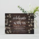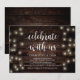 Vacker Fira med oss, Bröllopsannonsering / Bröllopskort, i Moderna Rustika Lantliga Strängljus, brunt träpapper tema. Detta är perfekt för din bröllopsfest och efterbröllopsfirande. Lägg till dina detaljer i matchande teckensnitt / bokstäver.