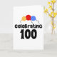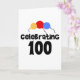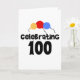 Tre primära färg-ballonger och svart text med texten "Firande 100" på 100-årsdagskort, T-shirts, mugg med flera.