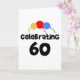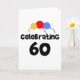 Tre primära färg-ballonger och svart text med texten "Firande 60" på 60-årsdagskort, T-shirts, mugg med flera.