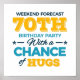 Dekorativ och färgfull 70:e speciella födelsedagskalender som med en rolig fras som Helg Prorecast 70:e Födelsedagsfest with a Change of Hugs. 70-årsdagen i lycklig för att fira din älskades födelsedag, till exempel din mormor, morfar, far, mor, morbror eller moster. 70-årsdagspressen i lycklig.
