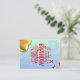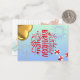 Framsida: Kortet har en ljusblå bakgrund. I mitten finns det en stor röd text som lyder "Grattis på födelsedagen till dig", som dekoreras med vita och röda stjärnor. Ovanför texten finns det två vita fyrverkerier, och de är små stjärnor som är spridda runt. För högerna finns det två presentlådor med rött rosett band, och i grund lämnat hörn finns det en gyllene hjärtformad ballong. Tillbaka: Det finns en feltryckt presentlåda och nalle, tillsammans med fraserna "vi önskar er allt gott" och "fira er speciella dag" i ett typsnitt av eleganten.