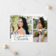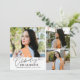 Modern och fantasifull examensbevis fotokort med 3 bilder på framsidan och 1 på baksidan. Texten säger "Firar examen" i skrivstil. Lägg till kandidatens namn, information och meddelande för att anpassa detta kort. Vit.