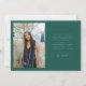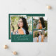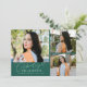 Modern och lekfull examensannonseringskort med 3 bilder på framsidan och 1 på baksidan. Texten 'Firar examen' är skriven i skrivstil. Lägg till namnet, informationen och meddelandet för att anpassa kortet. Grön.
