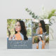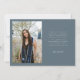Modern och fantasifull examensbevis fotokort med 3 bilder på framsidan och 1 på baksidan. Texten säger "firar examen" i skrivstil. Lägg till examen namn, information och meddelande för att anpassa detta kort. Skifferblå.