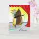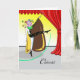 Firar! Dance Day i Lycklig, pappert hälsningskort med en illustration av en grym dansare med ett flytande landskap och en heaadress med blommor och stjärnor. Stora röda scengardiner på högernas sida av kortet. Art, bild och versell copyright © Shoaff Ballanger Studios.