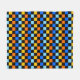A vibrant checkerboard pattern featuring alternating rows of orange, yellow, light blue, and blue squares against a black background. The design is bold and energetic.