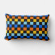 A vibrant checkerboard pattern featuring alternating rows of orange, yellow, light blue, and blue squares against a black background. The design is bold and energetic.