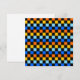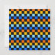 A vibrant checkerboard pattern featuring alternating rows of orange, yellow, light blue, and blue squares against a black background. The design is bold and energetic.