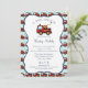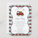Knubbigets röda brandmotor, inbjudan till babydusch med branddesign i lastbil i rött och blått med registerinformation på baksidan.