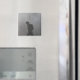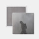 En magnet med ett foto av en brandman som går genom en dusch av vatten och rök.