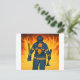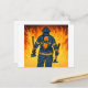 This postcard features a bold illustration of a firefighter standing firmly against raging flames.