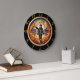 Honor the bravery of our first responders with the Firefighter Valor Heritage clock. This powerful timepiece features a high-definition graphic centered on a determined firefighter in full gear, flanked by two classic fire engines. The background is dominated by a majestic, stylized swirl of golden and orange flames that create a halo of light around the central figure. The artwork is set within a deep-toned circular frame, featuring elegant gold-leaf hour markers that stand out against a dark perimeter. While the design masterfully captures the movement of fire and the dimensional texture of professional equipment, this is a durable high-definition graphic application on a premium round clock face. It serves as a prestigious and meaningful tribute for any fire station, office, or home of a hero.