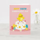 Designed with a soft pastel palette, the illustration centers on a fluffy yellow chick with wide, gentle eyes and an open smile, perched atop a two-tier cake as if posing proudly for someone it trusts. The cake is iced in creamy white with a scalloped frosting border, dotted with small red and coral round treats that read like berries. Yellow flower shapes and tiny green accents decorate the sides, giving the scene a spring garden feel 🌷. Around the base sit decorated eggs in muted tones—one striped yellow, one dotted teal, and one banded red—clustered close together like friends gathered for a sweet moment. The pink ground is sprinkled with tiny white daisies with yellow centers, adding a tender, affectionate atmosphere without needing any extra characters 🐰. Near the top, a short headline sits centered in bright contrasting colors, standing out clearly against the light background. The upper edge of the cake shows a neat frosting ridge with evenly spaced red and coral dots.