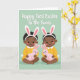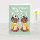 This design shows two nearly identical young children posed side by side on a soft pastel green background, arranged like a mirror image for a balanced, together-forever look. Each child has a dark complexion, curly dark hair, and a golden-yellow tunic with a bright white collar, creating a sweet matched-outfit moment that reads like close friendship. They wear headbands with tall ears lined in pink 🐰, adding a springtime touch without overpowering the scene. In their arms, each one holds a soft pink stuffed long-eared animal, and the way they cradle them close suggests a gentle, affectionate bond between the pair. Their wide eyes and rosy cheeks feel tender and connected, with a tiny first tooth peeking from one child’s smile as if they’re sharing the same happy secret. Near the top, a short line of white text sits centered above them, standing out clearly against the green backdrop. Small fluffy tails peek behind their outfits, and the pink ear linings echo the blush tones in their cheeks 🌷.