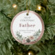 First Christmas as Father Personalized with Baby's Name, Birthdate, and Photo Round Ceramic Keepsake Ornament... A sweet bouquet of pink roses, pine cones, and holiday season botanicals decorates the rose gold metallic frame circling the text on front of your Christmas ornament gift for fathers. On back of the ornament is the baby's photo also framed by metallic rose gold. The example wording on this keepsake ornament reads "First Christmas as Father of Bethany Westfield 05.15.2025". All example text and the placeholder photo can be easily revised with your own on the personalization template.