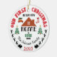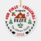 First Christmas In Our New Home round white ceramic Christmas Tree Ornament. The ornament has the option to be customized to your prefered Name and Year, and also the Town/City and State where your new home is. You even have the option to add your photo on the back of the ornament (or leave it as is with the generic winter landscape image, its up to you). Perfect gift idea for the Christmas holidays for every new home owner around the World.