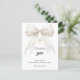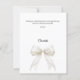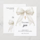 A modern and elegant First Communion thank you card. A white background, decorated with a large ivory colored bow with pearls and a golden cross. On the front the text: Thank You, name, and a date.