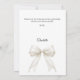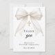A modern and elegant First Communion thank you card. A white background, decorated with a large ivory colored bow with pearls and a golden cross. On the front the text: Thank You, name, and a date.