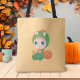 Baby är klädd i en grönt drakdräkt med orange spiken och matchande orange bib med skalle. En böjd pumpa står bara lite efter.
