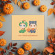 Spädbarn är klädd i Halloween-kostymer. Den på den lämnat är klädd som en grönt drake med orange spiken. Den på högerna bär en svart kattdräkt med stor orange. En böjd pumpa sitter mellan dem och bara lite bakom. Första inbjudan från Halloween fest till baby twillingar, vilken gender som helst.