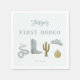 Rustiskt cowboytema 1:a födelsedag papper napkin från party med illustration av en cowboystöta, hatt, kaktus och orm. I texten står det "XX's FÖRSTA RODEO".