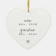 This personalized heart ornament is a beautiful way to announce a pregnancy to grandparents or celebrate a first-time grandma. The clean white ceramic design with sophisticated handwritten script reads "Mom est. 19xx, Grandma est. 20xx" followed by a sweet little heart. It captures the joy of family growth in a timeless keepsake she'll treasure forever.