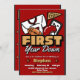 Celebrate your little MVP’s big day with this fun football-themed “First Year Down” invitation! Perfect for your baby boy’s first birthday party, this sporty design features a red and gold color scheme with football gear, a helmet, and a game playboard for that game-day feel.