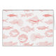 Hand - drawn vector pattern with various fishes in Living Coral color and white background.