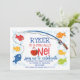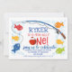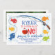 Färgfull ofiskalt En fiskecka Bobber 1:a födelsedagardagen Inbjudan till Cute-fiske Tema första födelsedag för en pojke som innehåller fem söta fiskar, fiskspole och rödspätta fiskebber. Den här fisketeckeninbjudan på 1:a födelsedag innehåller också ett foto på baksidan.