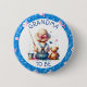 Personlig mormor som ska vara babyduschknappar. En ljuvlig liten vattenfärgsillustration av flicka i söta suspenderare som fiskar med en nalle. Färgen för dessa inbjudningar är blått och rosa.