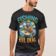 Den svarta t-shirt-skjortan har en glad tecknad som illustrerar en skäggig man som bär hatt och jacka, stolt och med stor fisk som han har fångat. Framför honom skrivs ord "FISHING" i ett stort, blått och grönt övertoningsteckensnitt, med ord "THE" i ett mindre, vitt, böjt teckensnitt. Under människan och fisken visas frasen "REEL DEAL" med fet stil, orange och gult. Bakgrunden visar en solig sjö-scen med träd. Denna plan firar att ett framgångsrikt fiskefiske i resa är tillfredsställande.