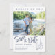"Het på dig" Ett outdoorsiskt, rostfritt fiske, temat Bröllop spara datum, med ett fiskande krok som håller ringar i bröllop i stålblått och grått. Anpassa inbjudan med förlovningens foto- och bröllop-information i det lämnat motiverade textblocket. Baksidan avslutas med ett stålblått fisknät mönster.