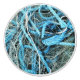 En färglös utformning av fiskenät och ljusblå rep från en båt och som förvaras på hamnbryggan.