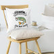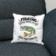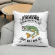 Den här bilden har en fyrkantig dekorativ kudde med ett humoristiskt fisketecknat tryck. Den centrala grafiken är en lysande färgad som illustrerar en fisk, eventuellt en bas, med munnen öppen, som om den fångades mitt i hoppet. Fisken är omgiven av en bandliknande banderoll, som innehåller en wittio påstående uppdelad i två delar: den översta bågen lyder "EN DAY UTAN FISKE", och grund-bågen slutar med "MEN VARFÖR RISKIT". Mellan bågarna överbringar slaglinjen "SANNOLIKT SKULLE INTE DÖDA MIG" budskapet. I utformningen används en klassisk kombination av typsnitt som framkallar en vintage känsla, och färg är ärligt med en viss realism i fiskens bild.