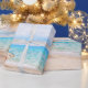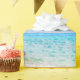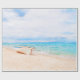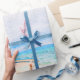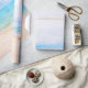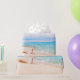 Fångar vattenfärgen på en strand med strand med akvablått hav och sol, sommaren himlar ovan.